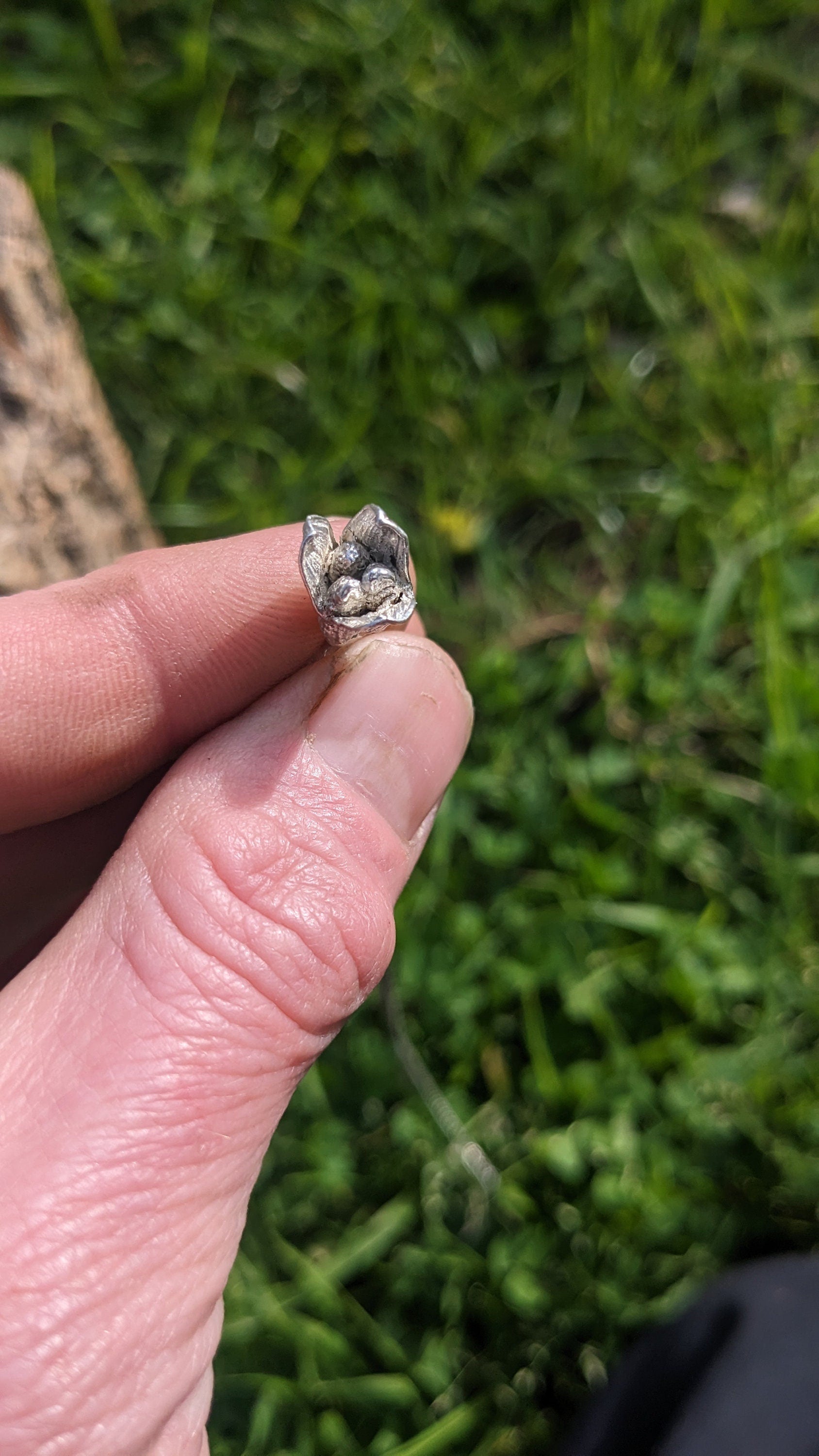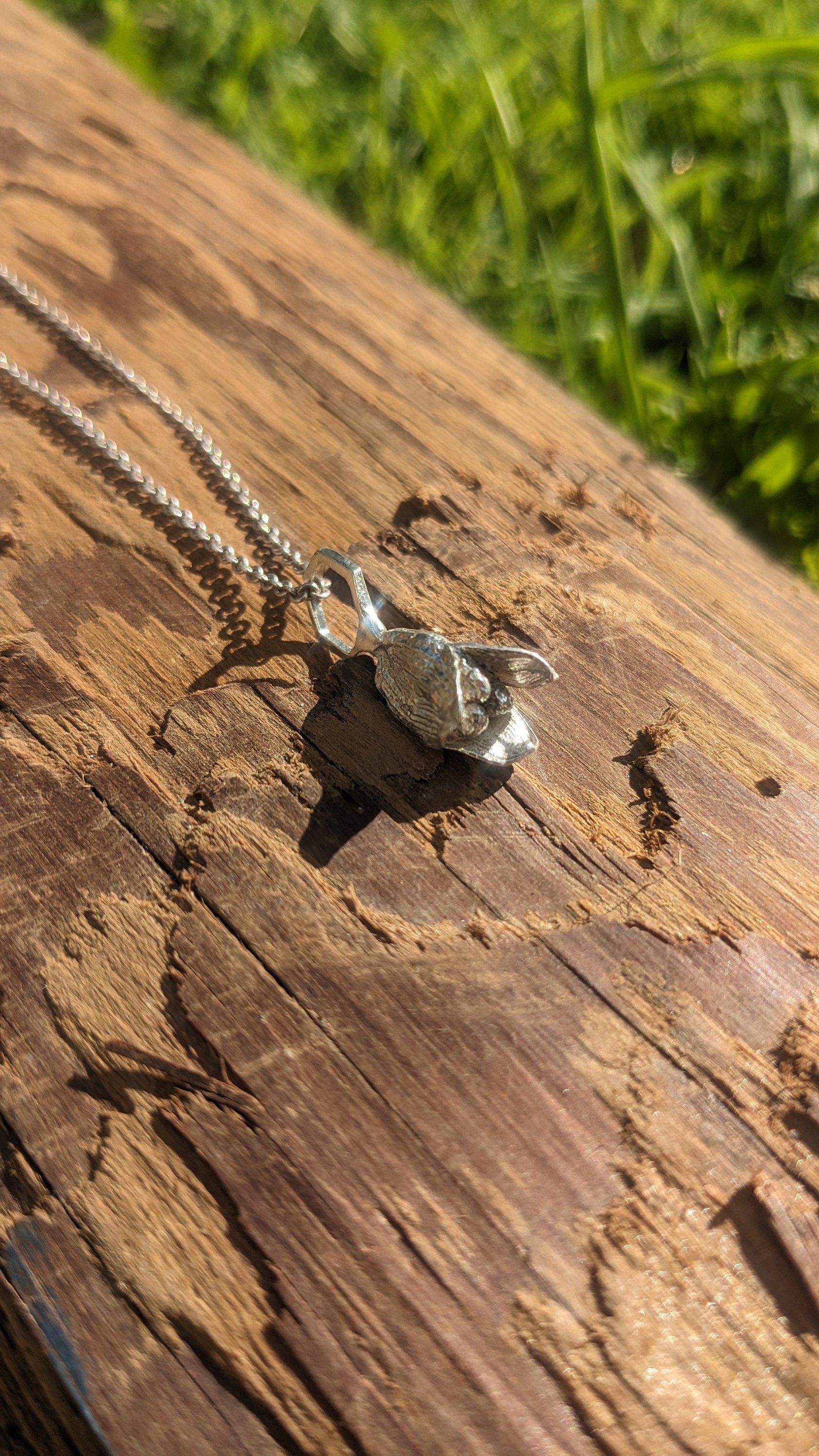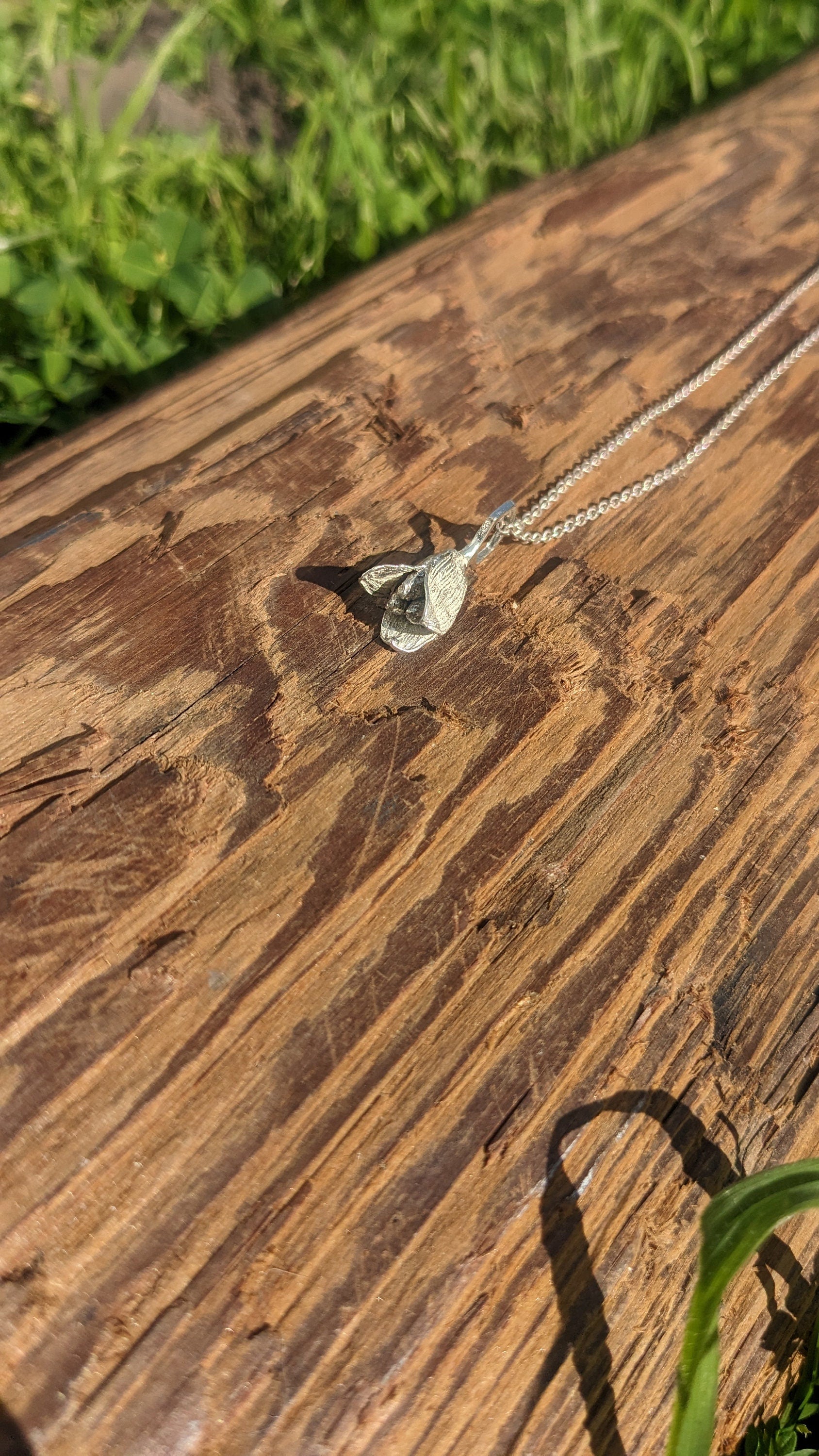 This necklace features a 1" x 0.375" x 0.375"/2.5cm x 1cm x 1cm pendant of a split open cardamom pod, showing the inner seeds, cast in solid recycled 925 silver, a traditional alloy of silver with a small amount of copper added for strength and durability, with a unique hexagonal bail and a 16" 925 silver chain with clasp.